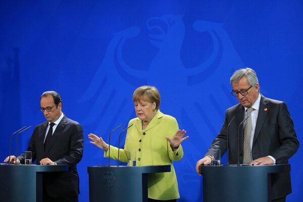 Angela Merkel, Germany's chancellor, center, speaks as Francois Hollande, France's President, left, and Jean-Claude Juncker, European commission president, listen during a news conference in Berlin, Germany, on Monday, June 1, 2015. With technical talks yielding no breakthrough, Greek Prime Minister Alexis Tsipras is seeking the intervention of Merkel and Hollande.Krisztian Bocsi/Bloomberg