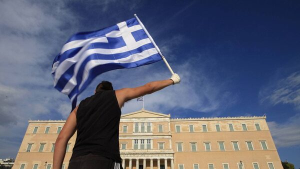 A protester raises Greek flag in front of the parliament in Athens.© Pascal Rossignol / Reuters/Reuters