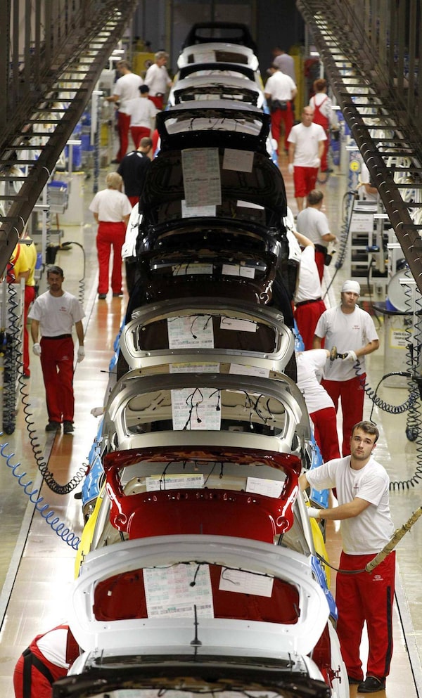 Workers assemble Kia cars in Zilina. Kia has an accompanying plant that produces engines for both itself and Hyundai, which returns the favour with transmissions.PETR JOSEK/Reuters