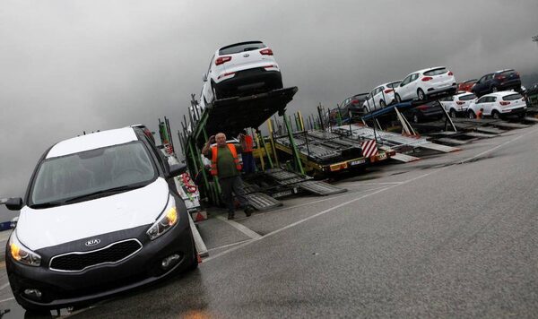 A worker loads Kia cars onto trucks at its factory in Zilina.PETR JOSEK/Reuters
