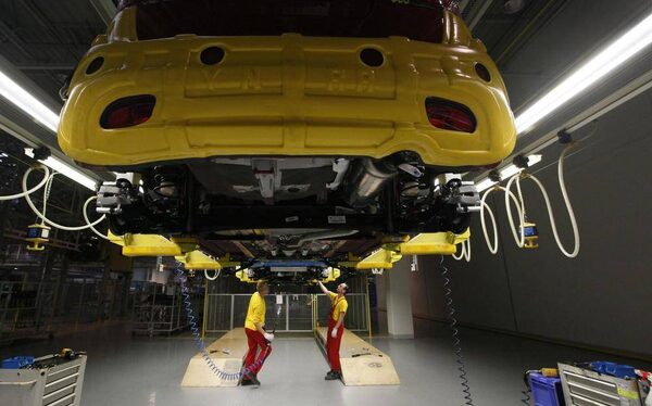 Workers assemble cars in the Kia factory in Zilina. Up the road in the foothills of Slovakia’s Fatra mountains, the most modern factory owned by Korean car maker Kia looks set to beat its production goal of 285,000 SUVs, compact and family cars.PETR JOSEK/Reuters