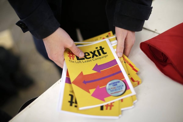 A campaigner arranges "#Lexit The Left Leave Campaign" leaflets on a table in Manchester, U.K., on Saturday, June 11, 2016. U.K. The pound tumbled the most in almost four months after the latest poll showed the campaign for Britain to leave the European Union took a 10 percentage-point lead less than two weeks before the referendum.Matthew Lloyd/Bloomberg