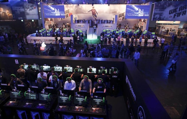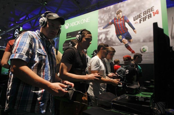 Visitors play ‘FIFA 14’ with the Xbox One at the Microsoft Games exhibition stand during the Gamescom 2013 fair in Cologne, Aug. 21, 2013.INA FASSBENDER/Reuters