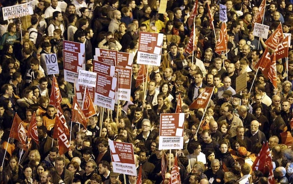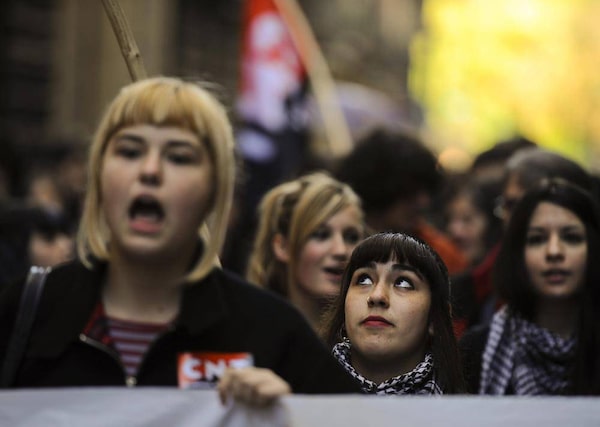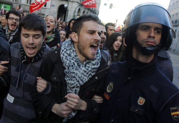 Youth demonstrators protest on a march during a general strike against government austerity measures, in Pamplona, northern Spain. Union leaders in Spain said more than 9 million workers joined the strike – the second this year. The government said participation was much lower and played down the impact, saying many services were functioning normally. Stores opened normally in many parts of the country, though some had protesters outside.Alvaro Barrientos/The Associated Press