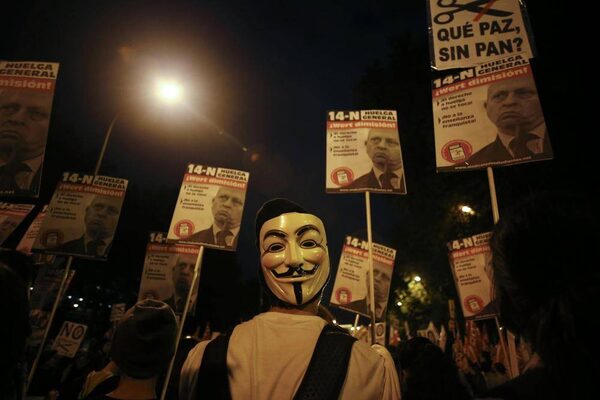 A demonstrator wears a Guy Fawkes mask as he takes part in a march during a 24-hour nationwide general strike in central Madrid.SUSANA VERA/Reuters