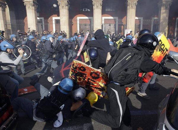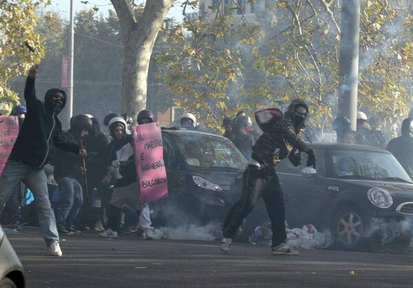 Demonstrators clash with police in riot gear during a protest against Italian government austerity measures in Rome. Protesters clashed with police in various demonstrations in Rome, Milan, Turin, Padua and Brescia.Gregorio Borgia/The Associated Press
