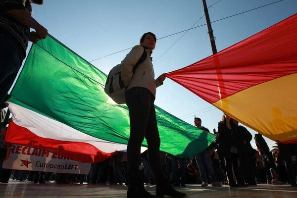 Protesters hold Spanish and Italian flags outside the Greek parliament during a protest in Athens.Thanassis Stavrakis/The Associated Press