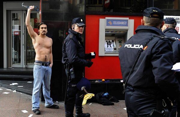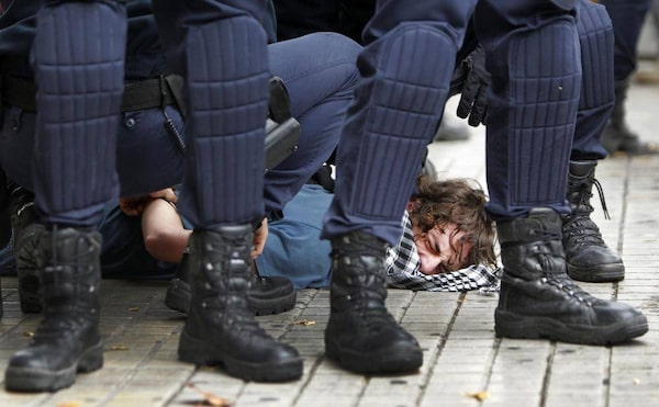 Riot police apprehend a protester during a general strike in Valencia, Spain.Fernando Hernandez/The Associated Press