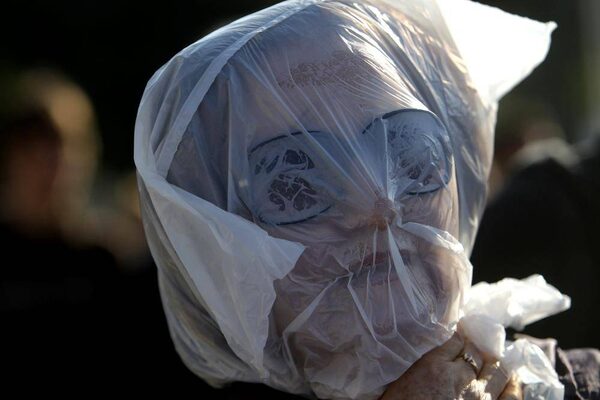 A protester covers her head in a plastic bag, meant to show that austerity measures are suffocating Greeks, outside Parliament during a union protest in Athens.Petros Giannakouris/The Associated Press