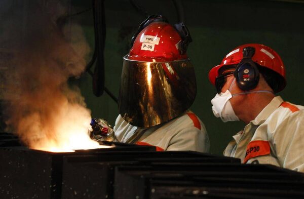 Workers prepare to pour molten silver.PETER ANDREWS/Reuters