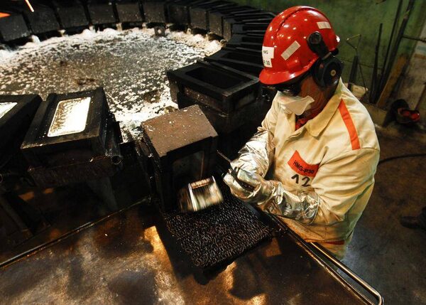 A worker pours melted silver into moulds.PETER ANDREWS/Reuters
