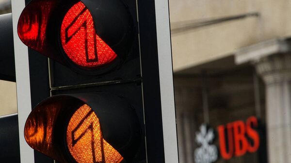 A sign of the Swiss banking giant UBS is seen behind traffic lights on September 18, 2011 in Lausanne.FABRICE COFFRINI