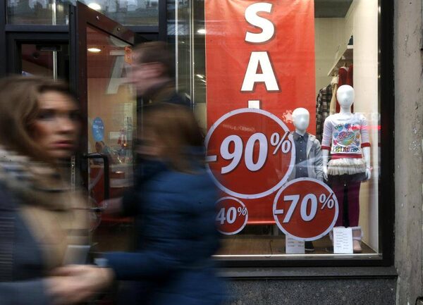 People walk past a shop with a sale advertisement in St. Petersburg November 7, 2014.ALEXANDER DEMIANCHUK/Reuters
