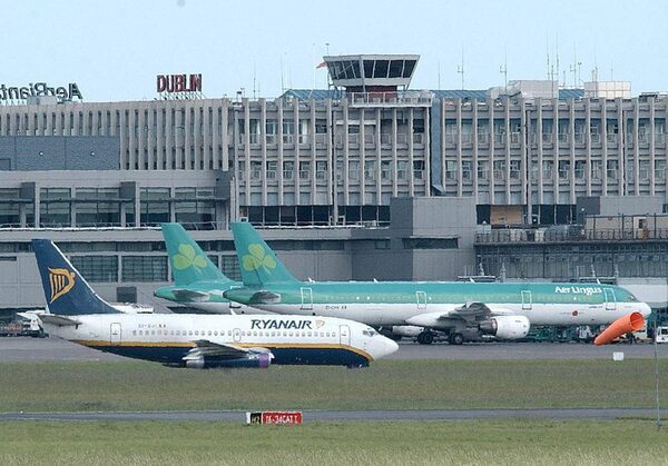 A Ryanair jet passes two Aer Lingus jets at Dublin Airport, Thursday October 5, 2006.JOHN COGILL/The Associated Press