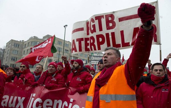 Union members march in solidarity in Brussels for Caterpillar employees who have lost their jobs.Geert Vanden Wijngaert/The Associated Press