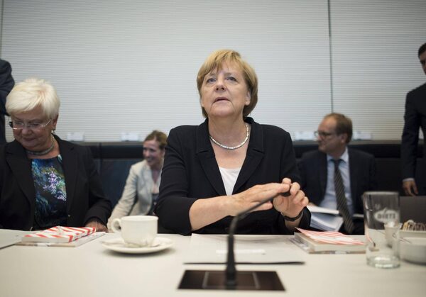 German Chancellor Angela Merkel attends a Christian Democratic Union (CDU) and Christian Social Union (CSU) party faction meeting in the Reichstag building before a parliamentary vote on a third bailout programme for Greece in Berlin, Germany August 18, 2015.STEFANIE LOOS/Reuters