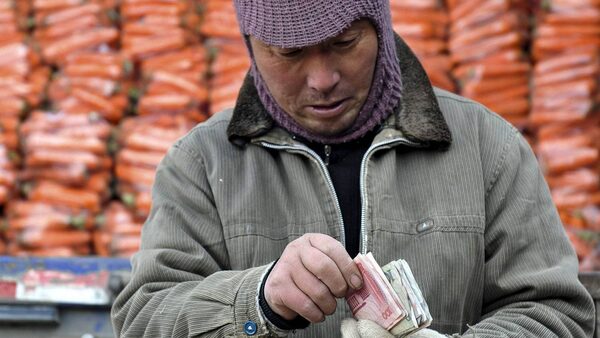 A man counts money in front of a truck loaded with carrots at a wholesale market in Fuyang in central China's Anhui province.The Associated Press