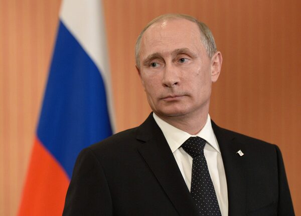 Russian President Vladimir Putin speaks to the media at Benouville castle on Friday, June 6, 2014. Western sanctions imposed on Russia tighten as fallout from the Ukraine crisis threatens to trigger a new Cold War.The Associated Press