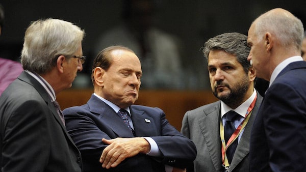 Italian Prime Minister Silvio Berlusconi (second, left) reacts as he talks with Luxembourger Prime Minister Jean-Claude Juncker (L) and Greek Prime Minister George Papandreou (R) during a working session of the European Council at the Justus Lipsius building, EU headquarters in Brussels, on October 26, 2011.ERIC FEFERBERG/AFP / Getty Images