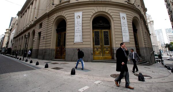 Pedestrians walk by the main entrance of the Buenos Aires Stock Exchange, Argentina, April 18, 2016.MARCOS BRINDICCI/Reuters