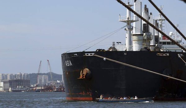 A boat takes passengers past a ship docked at the port of Santos Feb. 22, 2013. Dock workers shut down the movement of global commodities through Brazilian ports early on Friday during a six-hour strike.PAULO WHITAKER/Reuters
