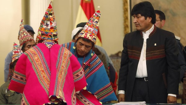 Bolivia’s President Evo Morales, right, and Quechua leaders participate in a signing agreement ceremony at which Canada's South American Silver’s mining rights were recinded, July 10, 2012. Morales' government and leaders of Quechua Indians in Bolivia’s southern highlands reached an agreement for the cancellation and subsequent reversal of the mining concession granted to the Canadian mining company.Juan Karita/The Associated Press