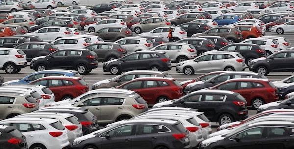 A worker walks through a parking lot of cars ready for shipping, outside Kia’s factory in Zilina, Slovakia.PETR JOSEK/Reuters