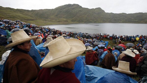Andean people gather after a march against Newmont's proposed $4.8-billion Conga gold mine, at the El Perol lagoon in the Peruvian region of Cajamarca. Protesters and farmers say the mine would cause pollution and hurt water supplies by replacing a string of alpine lakes with artificial reservoirs.ENRIQUE CASTRO-MENDIVIL
