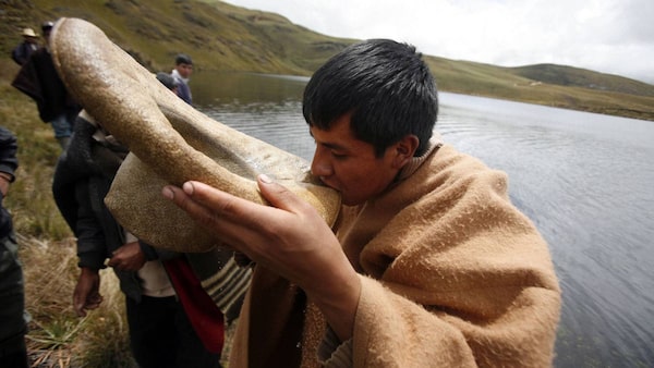 An Andean drinks water from the Cortada lagoon during a protest against Newmont's proposed $4.8-billion Conga gold mine, in the Peruvian region of Cajamarca. Protesters and farmers say the mine would cause pollution and alter sources of irrigation water by replacing a string of alpine lakes with artificial reservoirs.ENRIQUE CASTRO-MENDIVIL