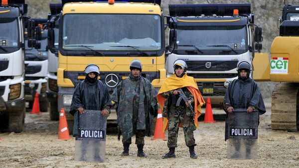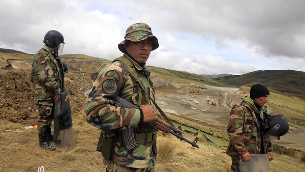 Peruvian police officers guard near machinery of Newmont's proposed $4.8-billion Conga gold mine to protect it from protesters near the Cortada lagoon in the Andean region of Cajamarca.ENRIQUE CASTRO-MENDIVIL