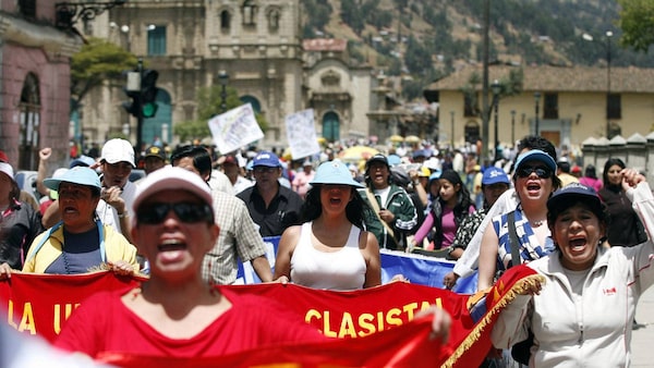 Protesters march during the second day of strike against Newmont's proposed $4.8-billion Conga gold mine, at the Peruvian city of Cajamarca.ENRIQUE CASTRO-MENDIVIL