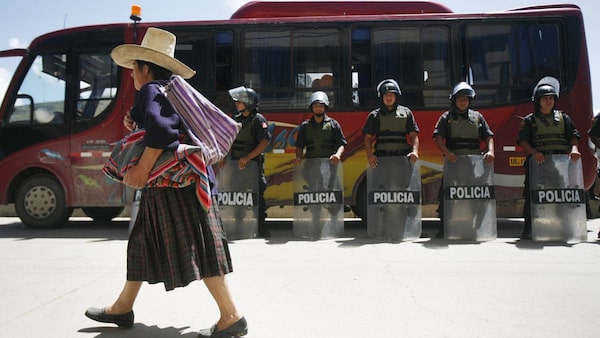 An Andean woman walks next to police officers during the second day of strike against Newmont's proposed $4.8 billion Conga gold mine at the Peruvian city of Cajamarca.ENRIQUE CASTRO-MENDIVIL