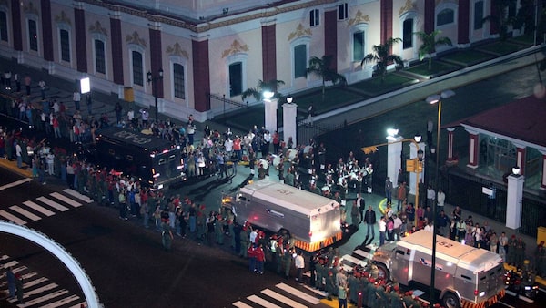 Armoured vehicles carrying gold bars drive past Miraflores Palace in Caracas, Nov. 25, 2011. The first shipment of gold bars arrived home in Venezuela on Friday after President Hugo Chavez ordered that almost all of the country's foreign bullion reserves be repatriated from Western bank vaults.Reuters/Reuters