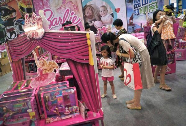 Women with their children visit Barbie toys on display for sale at the Kids Fun Expo in Beijing. Mattel manufactures Barbie toys.Andy Wong/The Associated Press
