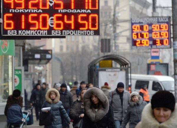 Pedestrians in Moscow walk under a board listing foreign currency rates against the ruble on Monday.VASILY MAXIMOV/AFP / Getty Images