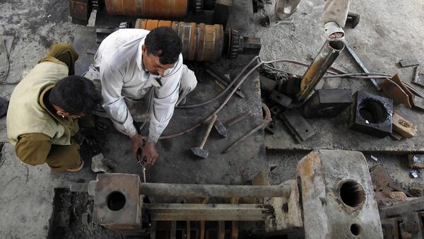 Afghan men work on a machine at a factory in Kabul on Oct. 4, 2011. Afghanistan is in desperate need of investment to invigorate its tiny, fragile economy, but on top of the grave physical dangers of the decade-old war, businesses are put off by corruption, pitiful infrastructure, and a slothful bureaucracy.OMAR SOBHANI