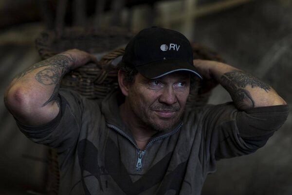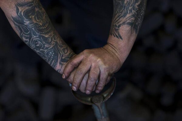 Mr. Schulz's tattoos are shown as he rests on a shovel at the Helmut Braun Combustible Fuel retailer.THOMAS PETER/Reuters