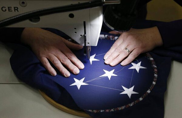 A worker sews stars on a U.S. national flag at the Waelkens flag company in Oostrozebek, Belgium Feb. 4, 2013.FRANCOIS LENOIR/Reuters