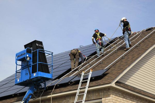 Workers install solar rooftop panels in this handout photo.Supplied
