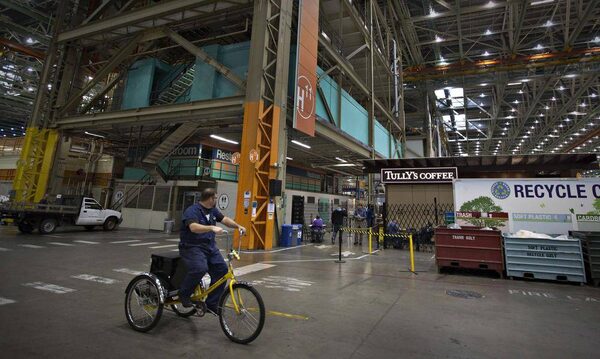A coffee shop sits in the middle of one of the hangars at the Boeing assembly plant in Everett. Airlines and investors will be watching when the company posts third-quarter results on Oct. 24.ANDY CLARK/Reuters