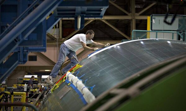 A worker makes adjustments inside the body of the Boeing 777. The company faces more competition than ever; Airbus, for instance, is inaugurating a new factory in Toulouse, France, for its A350 jet, a competitor to the 777 and 787.ANDY CLARK/Reuters