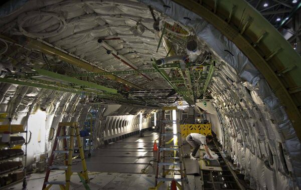 Workers rivet inside the body of a Boeing 777 at their assembly plant in Everett, Wash., October 18, 2012. Boeing Co. is ramping up production at all of its factories to produce more jets, more quickly than ever before.ANDY CLARK/Reuters