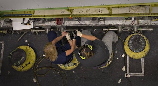 A pair of workers assemble a wing for the Boeing 777 at the plant in Everett.ANDY CLARK/Reuters
