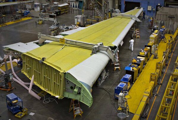 The wing for a Boeing 777 airliner sits on the assembly line at the Everett plant. Nearly 1 million rivets hold the wings together, and many are still hand-installed.ANDY CLARK/Reuters
