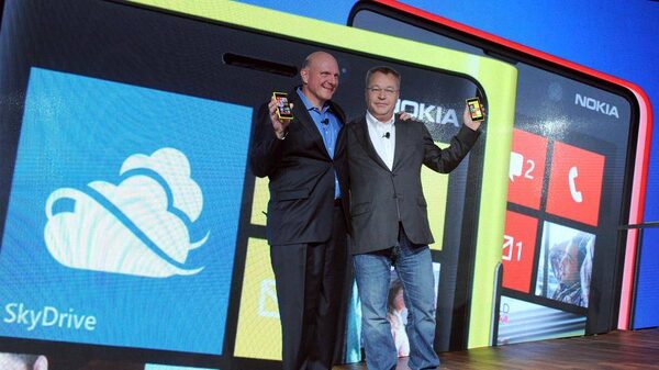 Microsoft CEO Steve Ballmer, left, and Nokia President and CEO Stephen Elop unveil the Nokia Lumia 920 and Nokia Lumia 820, Nokia's first devices for Windows Phone 8, at a press event in New York, Wednesday, Sept. 5, 2012.Diane Bondareff/The Associated Press
