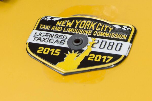 In this June 26, 2017 photo, the medallion of taxi driver and taxi medallion owner Marcelino Hervias is affixed to the hood of his taxicab on New York's Upper West Side. Three credit unions that specialized in loaning money against cab medallions, the hard-to-get licenses that allow traditional taxis to operate, have been placed into conservatorship as the value of those medallions has plummeted.Richard Drew/The Associated Press