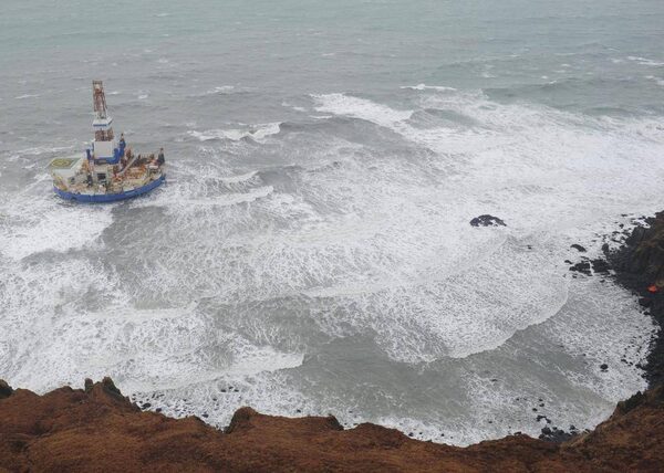 This aerial image provided by the U.S. Coast Guard shows the Royal Dutch Shell drilling rig Kulluk aground off a small island near Kodiak Island Jan. 1, 2013. No leak has been seen from the drilling ship, officials said Wednesday.Sara Francis/The Associated Press