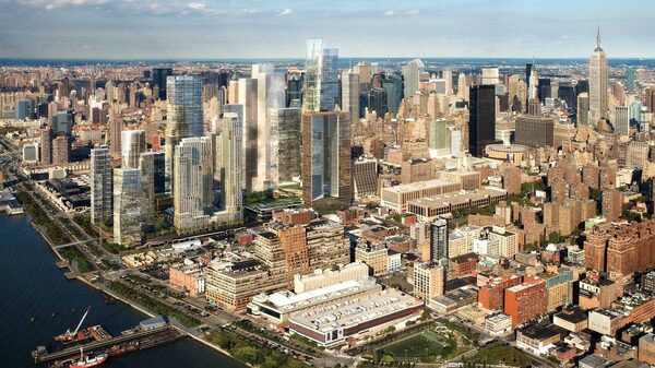 An aerial view from the south shows the Related Cos. Hudson Rail Yards development proposal on the West Side of New York in this artist's rendering.