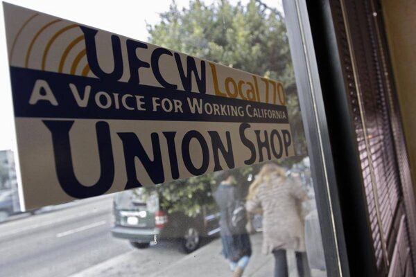 A UFCW Local 770 Union Shop sticker is pictured in the window at the Venice Beach Care Center, one of three medical marijuana shops in Los Angeles that are staffed by dues-paying union members.JONATHAN ALCORN/Reuters