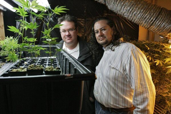 Brennan Thicke, left, a founder of the Venice Beach Care Center, and Rigo Valdez, an organizing director with United Food and Commercial Workers union (UFCW), pose together at the medical marijuana dispensary in Los Angeles, Feb. 6, 2013.JONATHAN ALCORN/Reuters